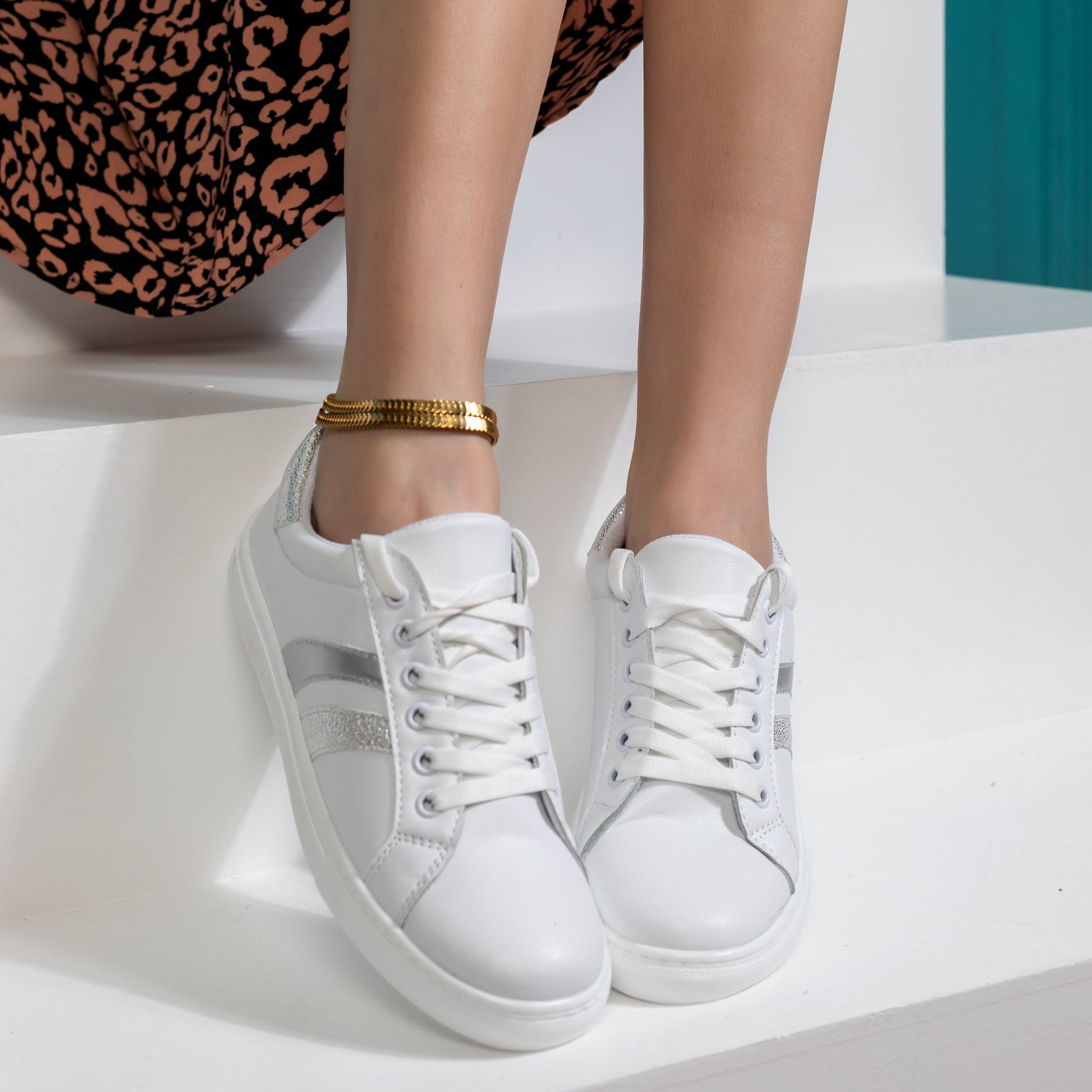 Elegant white sneakers adorned with shiny silver accents, offering perfect comfort and a modern, stylish look.
